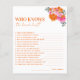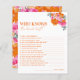 Viel Spaß beim Brautparty/Bachelorette mit diesem coolen Spiel mit hübschem Rosa und Orange Aquarell, floral und bearbeitbarem Text. Passen Sie es an, wenn nötig, indem Sie auf "Bearbeiten mit dem Design-Tool" klicken.