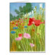 Eine hübsche Notizkarte mit einem Blumengemälde in Aquarellfarben eines roten und rosa Mohnblütengartens in der Nähe eines weißen Picketzaunes mit interessanter Aussicht und grünen Bäumen im Hintergrund.