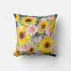 Niedliche und stilvolle bohrofarbene Gelbblumen und rosa Rosen auf einem marineblauen Dekorationskissen. Das ist ein wunderschönes Frühjahr- oder Sommerdesign, um Ihrem Zimmer einen fröhlichen Pop zu verleihen.