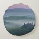 Rundes Wurfskissen mit einem nebeligen Sonnenaufgang mit einem rosa Himmel und einem Nebel zwischen den toskanischen Hügeln über agriturismo podere ILBelvederebauernhaus im Valdorcia (Orcia Tal) zwischen Pienza und San Quirico in Toskana, Italien.