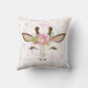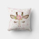 Dieses Kissen ist mit einem zauberhaften Giraffengesicht dekoriert, das mit sanften rosa und grünen Blume und Blättern geschmückt ist. Auf der einen Seite des Kissens sind die Augen der Giraffe geschlossen, auf der anderen Seite sind sie offen. Auf jeder Seite wird das Bild auf einem subtilen rosa und goldfarbenen Sternenhimmel platziert.
