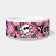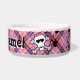Schwarze und rosa Ausrüstungsbeschreibungen ein Totenkopf mit gekreuzter Knochen mit einem rosa Bogen hoch auf den Kopf und die Herzen für die Augenhöhlen. Vervollkommnen Sie für das jugendlich oder jugendliche Mädchen, das in Schmutz emo oder in Monsterzombiematerial ist. Funky karierter Hintergrund des heißen Rosas mit schwarzen Farben-Spritzern. Fertigen Sie sie mit Ihrem eigenen Namen oder Text für den addierte spezielle Touch besonders an. Entwerfen Sie cutecomfy Copyright ©.