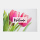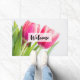 Eine Begrüßungstür mit einem wunderschönen Frühlingsfoto mit 2 rosa Tulpen und hellgrünen Blätter.