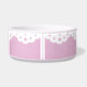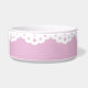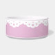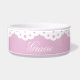 Hübscher Ösenspitzeentwurf trimmt die Spitze dieser hübschen rosa und weißen Haustierschüssel. Personifizieren Sie mit dem Namen von Ihrem wertvollen.