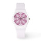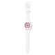 Das Design dieser Uhr erinnert an Baumwollbonbons. Es hat ein zartes Scrollwork-Muster mit Wirblen, grünen Designs in Rosa und Weiß.
