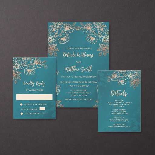 Rose Gold Floral Line Art Teal Wedding Begleitkarte