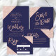 Rose Gold Glitzer Seitenfarbblock Typografie auf anpassbaren marineblau und Imitate Rose goldene geometrische Streifen schicke Hochzeit , ideal für elegante, luxuriöse Hochzeit,