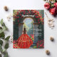 Ein großer Marmorbogen mit rote Rosen und Blume. Ein Mädchen mit einem roten und goldenen Kleid, das einen Tiara trägt. Personalisieren und fügen Sie einen Namen und Details. 1 Blatt = 1 Einladung mit Druckkante bis Kante.