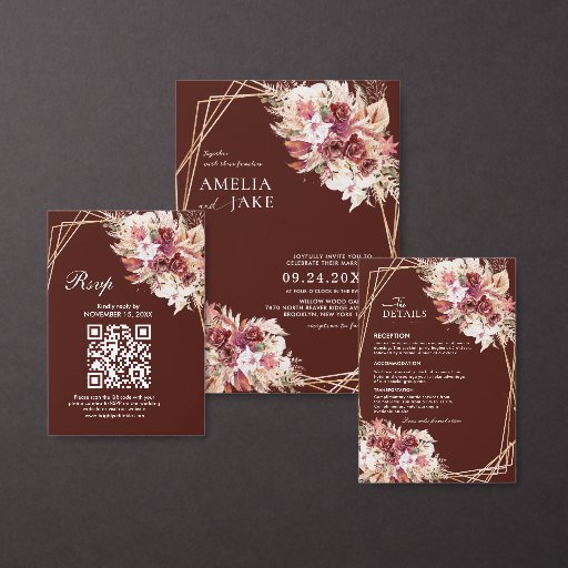The modern gold geometric frame and rich burgundy watercolor florals create a romantic, elegant look that coordinates beautifully with your full invitation suite.