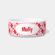 Dieses niedliche Haustiergericht zeigt ein rotes und rosa Raute- und Herzklopfmuster und einen Platz, um den Namen Ihres Haustieres hinzuzufügen.