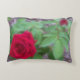 Rote Rose mit weichem Fokus und eine Rose mit grünem Blattwerk auf einem Kissen