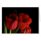 Diese herrliche Anmerkungskarte kennzeichnet einen Blumenstrauß der roten Tulpen des Scarlet und Grün verlässt Set auf einem reinen schwarzen Hintergrund.