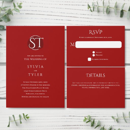 Eine Wappen Monogramm Hochzeitseinladung in Rot mit minimalistischem Design. Bereit zum Karo Einladungen von Ihrer Liste zu tun? Fügen Sie Ihren Text, fügen Sie diese Einladung in Ihren Warenkorb, und eine wunderbare Hochzeit. Red Typografy Wappen Monogram Wedding Invitation Holidayday Design | ©Melissa Patton - Designer