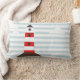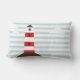 Niedlicher roter und weißer gestreifter Leuchtturm über einem weißen und hellblauen gestreiften Hintergrund mit niedlichen punktierten Linien bewölkt sich. Die Rückseite hat eine feste rote Farbe mit Ihrem Familiennamen im Weiß.