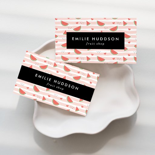 Niedliche, lustige und bezaubernde Visitenkarten mit Wassermelonen, Herz und Streifen. Modernes und trendiges Design, ideal für Obstläden, Obstverkäufer und Bauer Märkte.