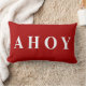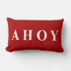 Eleganter, moderner und modischer Strand oder Küstendekor roter und weißer Seesegeln- oder Bootsentwurf Lumbar oder Wurfskissen oder -kissen mit einem roten Hintergrund und weißer ein Text oder eine Typografie "ahoi" auf einer Seite und den roten und weißen Streifen auf der anderen Seite. Dieser zeitgenössische elegante Entwurf erhöht jedes mögliches Zuhause, Strandhaus, Schlafzimmer, Sofa, Wohnzimmer, Büro oder Boot.