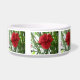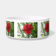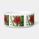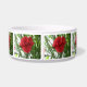 Dieses phantastische Haustierschüssel zeigt ein detailliertes Foto einer atemberaubenden roten Carnation-Blume. Das Foto wurde mit Makrofotografie aufgenommen, um die Schönheit dieser leuchtend roten Blüte, umgeben von grünem Blattwerk, zu zeigen.