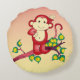 Dieses niedliche Rundkopfkissen zeigt einen roten Affen mit einem langen Schwanz auf einem Baumzweig, umgeben von grünen Blätter.