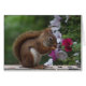 Diese Anmerkungskarte kennzeichnet ein entzückendes rotes Eichhörnchen, das einen Imbiss der Sonnenblumensamen mit einem Hintergrund der rosa und weißen Petunien und des reizenden Grüns isst. Ein kleineres Bild des gleichen Eichhörnchens ist nach innen.