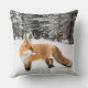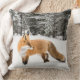Roter Fuchs mit buschigen Schwanz in kaltweißem Schnee. Große grüne Pinienwälder im Hintergrund. Schöne Natur.