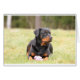 Ein gesunder, robuster und stolz aussehender Rottweiler, der auf dem Rasen stehend ist. Rotweiller sind bekannt für ihre intelligenten Hunde und sehr gute Schützer.