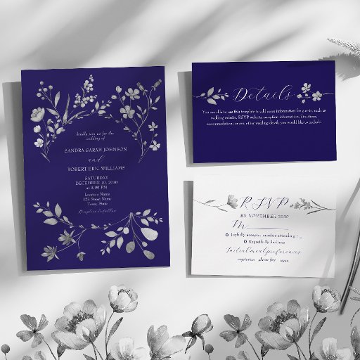 Set in einem edlen Ton an Ihrem Empfang mit diesem königsblauen Hochzeitsmenü mit zartem silberfarbenem Blumenwerk und eleganter Kalligrafie. Dieses raffinierte Design ist perfekt für formelle Winterhochzeiten geeignet und hebt Ihre Speisenauswahl in einem sauberen und anmutigen Rahmen hervor.