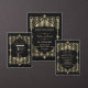 Royal, Romantisches, Vintages Kartendesign mit einem Great Gatsby, Roaring 1920er Jahre alten Hollywood Art Deco Stil, königliche Imitate goldene Fleur-de-lis, Vintage Schriftart; auf der Rückseite prächtige Art Deco Muster auf schwarz. Verwenden Sie das Tool Personalisieren, um Ihre Informationen hinzuzufügen. Für mehr, besuchen Sie bitte meine Glam Royal Gold Black Collection.