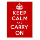 "Keep Calm und Carry On war ein Propagandaposter, das 1939 während des Zweiten Weltkriegs von der britischen Regierung produziert wurde und die Moral der britischen Öffentlichkeit im Falle einer Invasion erhöhen sollte. Da es nur eine begrenzte Verteilung gab, war es wenig bekannt. Das Plakat wurde im Jahr 2000 wiederentdeckt und wurde von einer Reihe von Privatunternehmen neu herausgegeben und als dekoratives Thema für eine Reihe anderer Produkte verwendet. Es gibt nur zwei bekannte Beispiele für das Plakat außerhalb der Regierungsarchive."