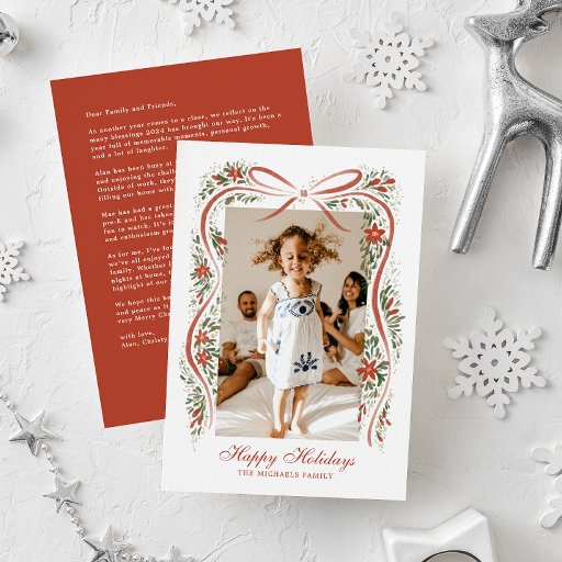 Erleben Sie eine festliche Feier mit dieser süßen Party Einladung, die mit einem handillustrierten, roten Bandbogen und einem botanischen Rahmen aus Poinsettia-Blume und Grünpflanzen aufwartet. Der Einladungstext ist flexibel und leicht zu bearbeiten, um Ihre Veranstaltung zu Anzug und die Kartenrückseite ist ein leerer Rahmen für weitere Informationen, Fotos und alles andere, was für Ihre Feier relevant ist.