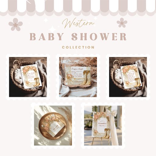 Ein rustikales Design mit schicker Babydusche mit Cowgirl-Stiefeln, die mit rosafarbenen Blütenblättern, weicher Vegetation und glänzenden Golddetails betont werden. Ideal für ein Western-Fest mit einer femininen blumigen Drehung.