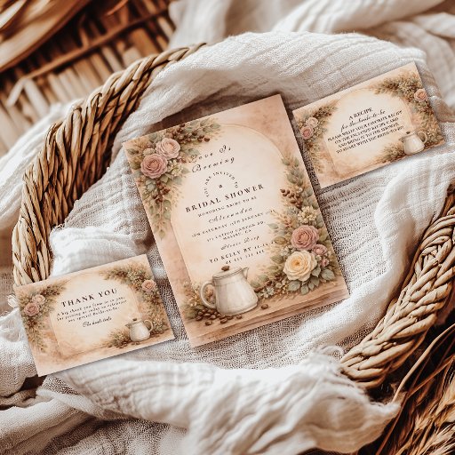 Warm, romantic, and effortlessly cozy, this coffee-inspired bridal shower design features blush roses, espresso beans, and a charming cappuccino detail layered over a softly aged parchment background. The rich caramel and mocha tones create a welcoming café atmosphere, perfect for fall celebrations or brunch gatherings. Elegant typography balances the rustic warmth, making it ideal for coffee lovers and brides who adore intimate, cozy-chic details. A beautiful choice for an autumn bridal celebration filled with love and lattes.