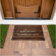 Rustic wood welcome doormat personalized with family name and established year.