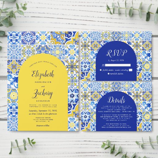 Dieses rustikale Design zeichnet sich durch ein Hintergrundmuster von blauen, gelben und weißen Aquarellen portugiesischen Fliesen oder Azulejos. Personalisieren Sie es mit den Namen der Braut und des Bräutigams in blauem Kalligraphieskript und dem verbleibenden Text in einer Kombination aus Sans Serif, Copperplate und Kursivschrift auf einer weißen Bogenform. Auf der Rückseite wird ein passendes Fliesenmuster angezeigt.