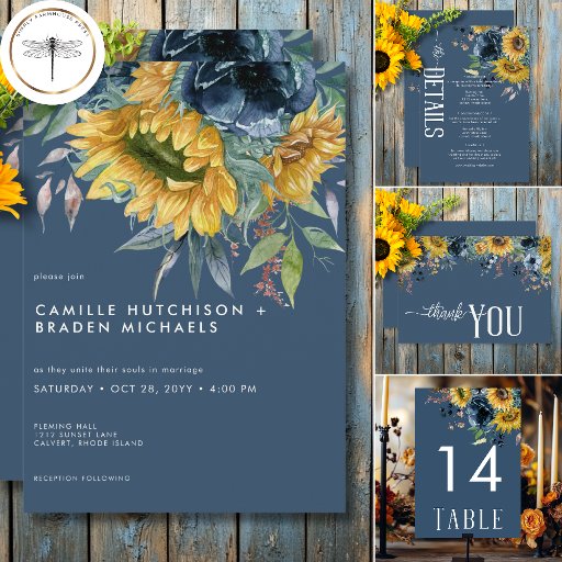 Mit dieser atemberaubenden Sonnenblumenübersicht und dem Umzäunungsausweis feiern Sie die Wärme und Lebensfreude Ihrer Liebe. Die lebhaften Gelb- und Brauntöne der Sonnenblumen, ergänzt durch die staubigen blauen Mohnblumen und das üppige grüne Blattwerk, schaffen eine bezaubernde und fröhliche Atmosphäre. Der dunkelblaue Hintergrund verleiht dem Ganzen eine Touch Raffinesse, während der schlichte weiße Schriftart ein modernes und elegantes Aussehen verleiht. Dieses Design ist die perfekte Wahl für eine Sommerhochzeit, die das Wesen des Glücks und des Feierns einfängt. Lass deinen Gästen mit diesem atemberaubenden Design in die Wärme und Schönheit deines besonderen Tages gezeichnet zu werden. Erstellt von der einfachen Farmhouse Press.