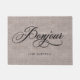 Diese französische rustikale und elegante Fußmatte sagt "bonjour" in der Wirblen, schwarzen Kalligraphie auf einem Leinenleinwandblickhintergrund und hat eine Stelle für Ihren Familiennamen.