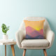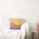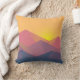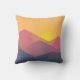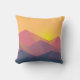 Ein Kopfkissen mit einer grafischen Abbildung mit vielen Berggipfeln mit hellgelbem Sonnenlicht hinter den Bergen. Mit geometrischen polygonalen Formen gefertigt. Einfaches minimalistisches Design. Die Farben reichen von dunkelblau bis wüstenrot.