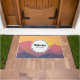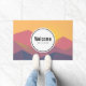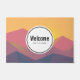 Begrüßungstürmatte mit einer grafischen Abbildung vieler Berggipfel mit hellgelbem Sonnenlicht hinter den Bergen. Mit geometrischen polygonalen Formen gefertigt. Einfaches minimalistisches Design. Die Farben reichen von dunkelblau bis wüstenrot.