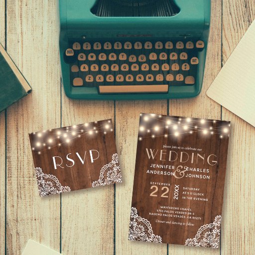 Rustikale Holz-Streichelleuchten und Spitzen | UAW Einladungspostkarte