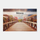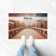 Eine willkommene Tür mit einem landschaftlichen Foto. Eine Holzbrücke führt zu einem Weg, der von farbenwechselnden Waldbäumen umgeben ist.