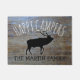 Niedliches rustikales Campingsdekorgeschenk für rvers, pensionierte Paare, Wanderer, Lagerbewohner und Naturliebhaber. Personalisierte, rustikale hölzerne Blickfußmatte, die glückliche Lagerbewohner mit einer Schablone für das Addieren des Familiennamens an der Unterseite in den schwarzen Buchstaben lesen, oder was Farbe oder Art, die Sie beschriften, bevorzugen Sie. In der Mitte ist ein Schatten eines Elchs mit seinen Geweihen Teil der oberen Buchstaben "halten". Gegen ein Hintergrund-Foto des rustikalen, beunruhigten alten Holzes. Einzigartiges Ruhestandsgeschenk, auch. Seien Sie zu Hause vor einem RV oder einem gemütlichen Blockhaus recht.