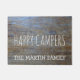 Niedliches rustikales Wohngestaltunggeschenk für rvers, pensionierte Reisende, Wanderer, Lagerbewohner und Naturliebhaber ist diese personalisierte hölzerne Blickfußmatte, die glückliche Lagerbewohner mit einer Schablone für das Addieren des Familiennamens unten in den weißen Buchstaben lesen. Gegen ein Hintergrund-Foto des rustikalen, beunruhigten Holzes, das geschrammt und alt ist. Großes Ruhestandsgeschenk, auch. Seien Sie zu Hause vor einem RV oder einem gemütlichen Blockhaus recht.