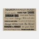 Personalisieren Sie diese lustigen Familienregeln Türmatte. Fügen Sie einfach Ihren Nachnamen hinzu und wählen Sie die gewünschte Farbe, die Ihre Besucher Liebe, wenn sie kommen und besuchen. Macht auch das perfekte Jubiläum oder Hauswärmeschenk. Nur eine andere Möglichkeit, Ihr Party ganz besonders zu gestalten, um die Zuhause und Hostess Kollektion zu besuchen.