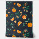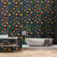 Akzentuieren Sie Ihre Wände mit dieser gemusterten Tapete aus Zitrusfrüchten. Es bietet lebendige Orangen und Orangenblüten mit blühendem Blattwerk, das auf einem dunkelblauen marineblauen Hintergrund tanzt.