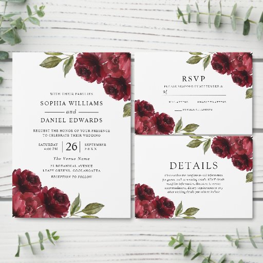 Rustikale romantische Burgunder Rote Rose Hochzeit Einladung