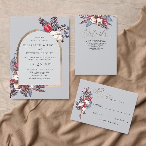 Rustikale Winterwolle Dusty Blue Red Berries Gold Wedding Einladungen
