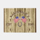 Ein patriotisches amerikanisches Fahnendesign an einer Holzstalltür, mit Hufeisen und eigenem Text, um Ihren Namen auch hinzuzufügen
