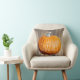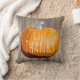 Dieses urbane Themenkissen bietet einen plumpen orangefarbenen Kürbis bereit für die Ernte mit den Worten "danke" in Weiß. Der Hintergrund ist ein rustikaler Holzsteg gedruckt.