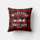 Rustikales, modernes Kissen mit einem trendigen Wald-Gebirgsdesign mit einer Bergkette, Kiefern, Wäldern und Vögeln, umgeben von Ihrem eigenen Familiennamen auf bedrucktem rotem Büffel, kariertem Hintergrund, einem personalisierbaren Namen Ihrer Hütte, Kabine, Seehaus oder anderen familiären Ansammlungen, sowie dem Jahr, das gegründet wurde.