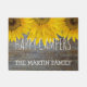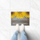 SOMMER- oder Fall-Wohngestaltunggeschenk des niedlichen rustikalen Landes beschriftet Blumenfür rvers, pensionierte Reisende, Gärtner, Camper und die outdoorsy personalisierten Arten, rustikale hölzerne Blickfußmatte, die glückliche Lagerbewohner in der rustikalen Art mit einer Schablone für das Addieren des Familiennamens unten im weißen lesen, handgeschriebenen Blick. Gegen ein Hintergrund-Foto des rustikalen, beunruhigten Holzes, das geschrammt und mit den riesigen gelben Landsonnenblumeblumenblättern alt ist, welche die Spitzengrenze verzieren. Großes Ruhestandsgeschenk auch für die pensionierten Paare bereit, auf das Straßen- oder Familiengeschenk für die zu gehen die wie, zum in ihr motorhome zu reisen. Hübscher Herbstdekor. Seien Sie zu Hause vor einem RV oder einem ursprünglichen Blockhaus recht.