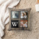 Rustikales Bauernholzhinterland mit 3 Foto-Steckplätzen, schwarzen Rahmen und einem Monogramm in Weiß. Auf der Rückseite des Kissens stehen Stallholz und schwarze Hirschgeweihe mit einem Monogramm-Buchstaben.
